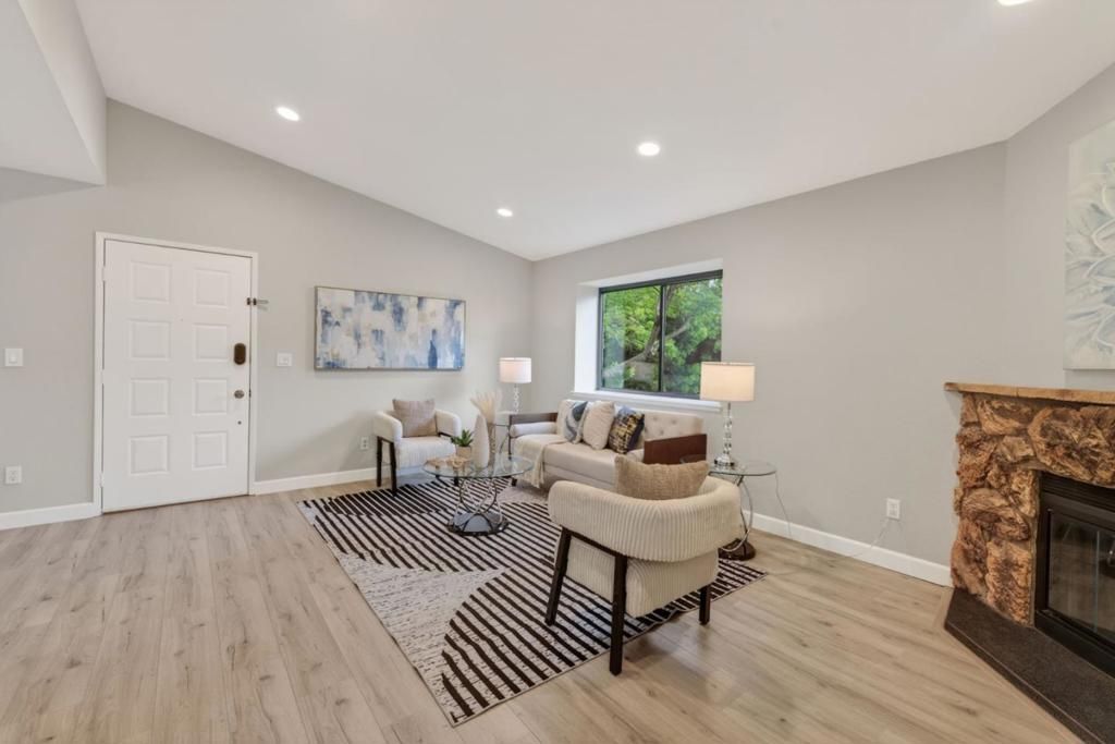 Centrally located in San Jose's Silicon Valley, walking distance to Santana Row and Valley Fair mall, as well easy access to highway arteries and tech companies nearby. This condo is spacious with high living room ceilings and an open floor plan. Ample privacy on your serene balcony with views of luscious trees sitting on a corner unit. The kitchen is equipped with quartz countertops, an electric cooktop, oven range, microwave, refrigerator, dishwasher, garbage disposal, and exhaust fan, and opens up to a combined kitchen and family room area. Freshly painted interior and gorgeous flooring to match. The living space includes a cozy fireplace and a dining area near the kitchen. Comfort is maintained year-round with central air conditioning and electric heating. Laundry conveniently located inside the unit, offering a washer and dryer. The property includes a one-car attached garage and is part of a quiet community and neighborhood. HOA VALUE INCLUDES WATER AND GARBAGE.