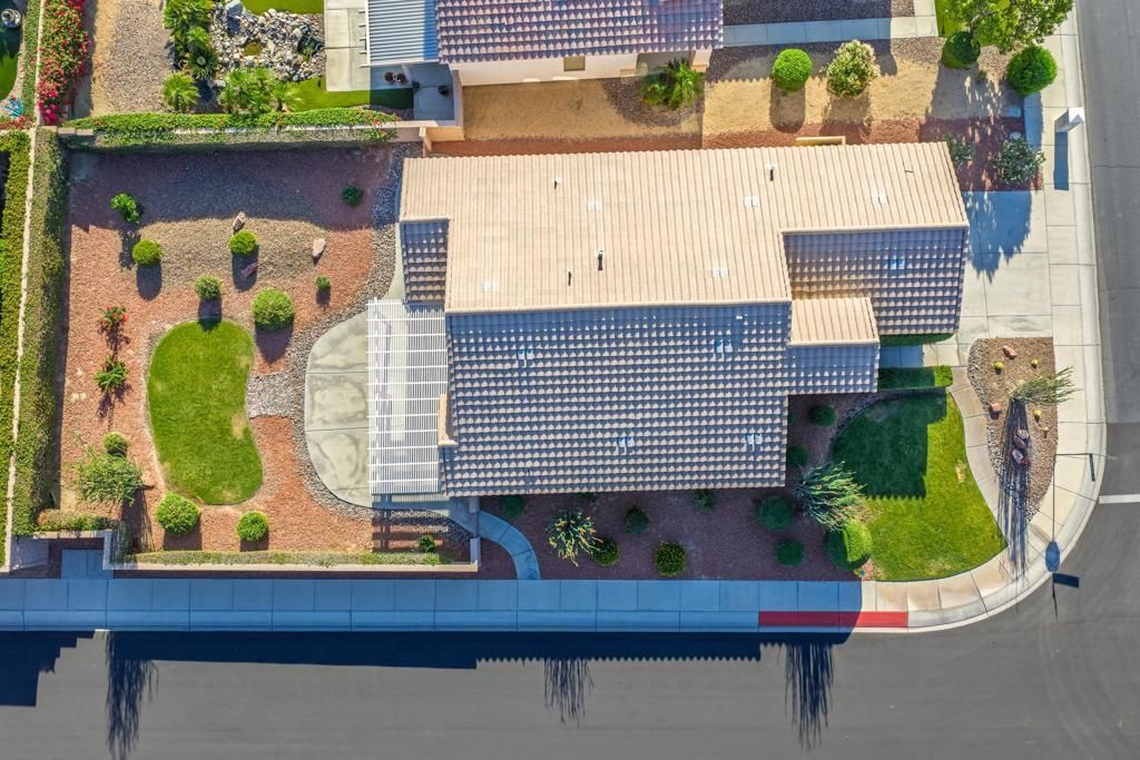 Sun City Palm Desert - Cayman. This popular greatroom floorplan offers 2 bedrooms, 2 bathrooms and a versatile den, ideally situated on a quiet cul-de-sac street that conveniently terminates at the Sunset View Clubhouse. Positioned on a desirable corner lot, the home enjoys a spacious, lushly landscaped north facing rear yard featuring an extended patio, alumawood patio cover, mature ocotillo and peek-a-boo mountain views. Inside, tile flooring is used extensively. The kitchen is thoughtfully designed with corian counters with rounded edges, a glass tile backsplash, and a chef's island with breakfast bar. The adjoining dining area features a bay slider that opens to the rear patio, enhancing indoor-outdoor living. The den/office is generously sized and finished with attractive wood-like tile flooring. The primary suite includes a walk-in closet with mirrored wardrobe doors and an en-suite bathroom with dual sinks and a stall shower with glass enclosure. The guest bedroom also features mirrored wardrobe doors, and the guest bathroom includes a tub/shower combination. The laundry room is conveniently located inside the home. Additional features include a spacious two-car garage with built-in storage and a Lennox AC system installed in 2019.