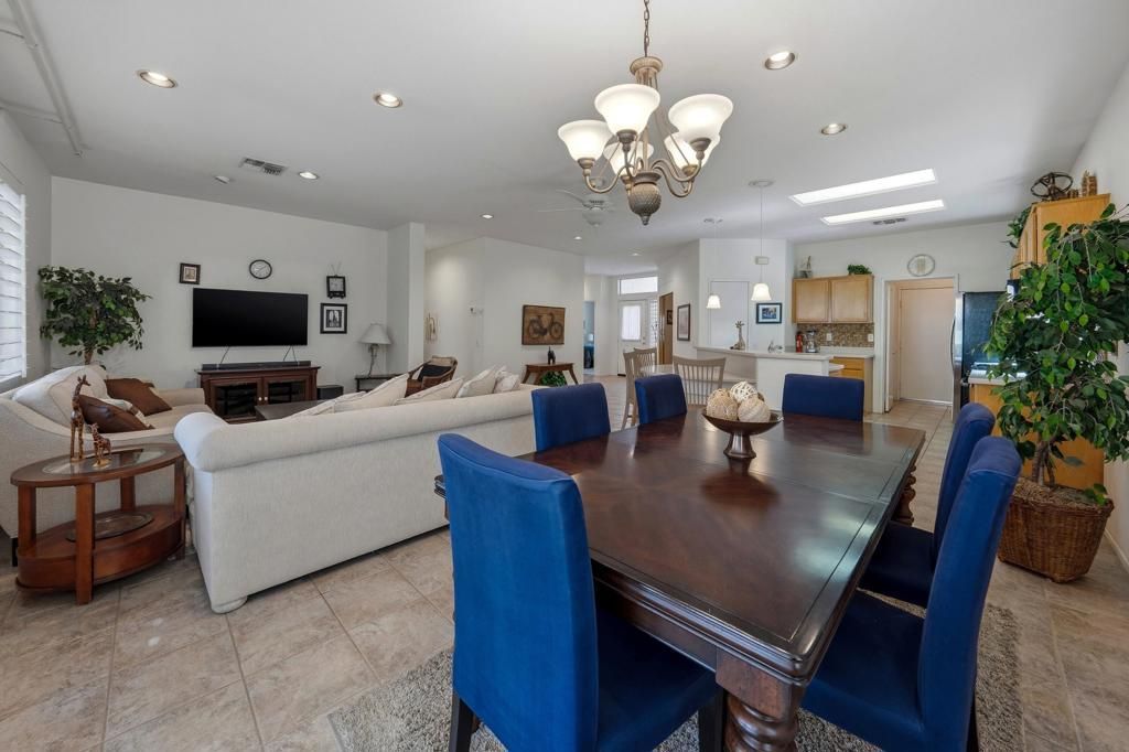 This St. Maarten model shows like a model. It is being offered ''turnkey'' furnished including a 2022 EZ Go golf cart. An open floor plan with 2BR/2B and den.Tile in most areas and carpet in BRs and inset carpet in great room. Plantation shutters are throughout. Ceiling fans in all traffic areas. Stainless appliances, corian counters and lovely backsplash and a walk-in pantry and large island for additional seating, Primary bedroom is large and has sliders to backyard. Primary bathroom has dual vanities and lots of storage. Laundry room is inside the home with additional storage cabinet. HVAC system replaced in 2024. Water heater replaced in 2025. Extended aluma wood patio cover in 2023. Backyard offers large seating areas with view to mature landscaping. 2 car garage has built-in storage cabinets.